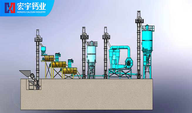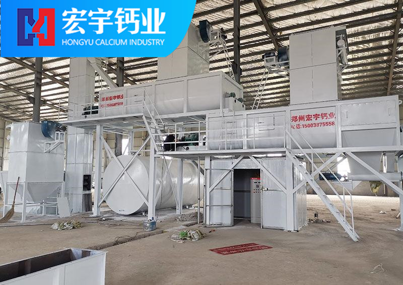 将合格的氧化钙(CaO)块料由鄂式破碎机破碎至40mm左右粒度,经斗式提升机送入氧化钙储存罐料仓,料仓中的氧化钙经稳流输送机定量稳重系统进入氢氧化钙Ⅰ级消化器进行初步消化,当氢氧化钙完成初级消化以后进入Ⅱ级消化或Ⅲ级消化器,使氧化钙消化分解,生成合格的氢氧化钙初级产品,消化率达到98%,(消化系统根据产能要求,机型设计分为单轴、双轴及多轴机型)。消化分解好的氢氧化钙再由半成品螺旋输送机送入选粉机内,由选粉机完成产品杂质分离和细度分级,完成分级后的终端合格产品,由成品输送机、提升机卸入成品氢氧化钙罐仓进行分别包装。本套生产线所有污染节点由脉冲除尘器完成,收尘率达到99.5%。